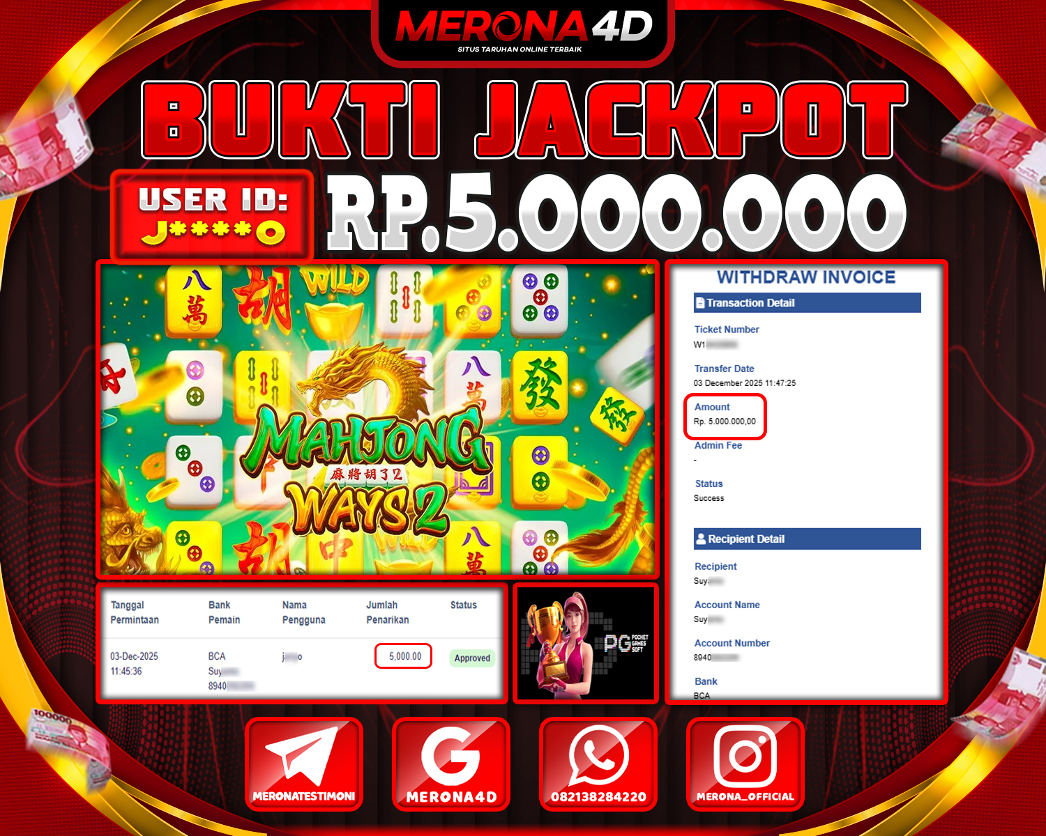 Selamat Kepada Member MERONA4D M****3 Telah Jackpot Di MAHJONG WAYS 2