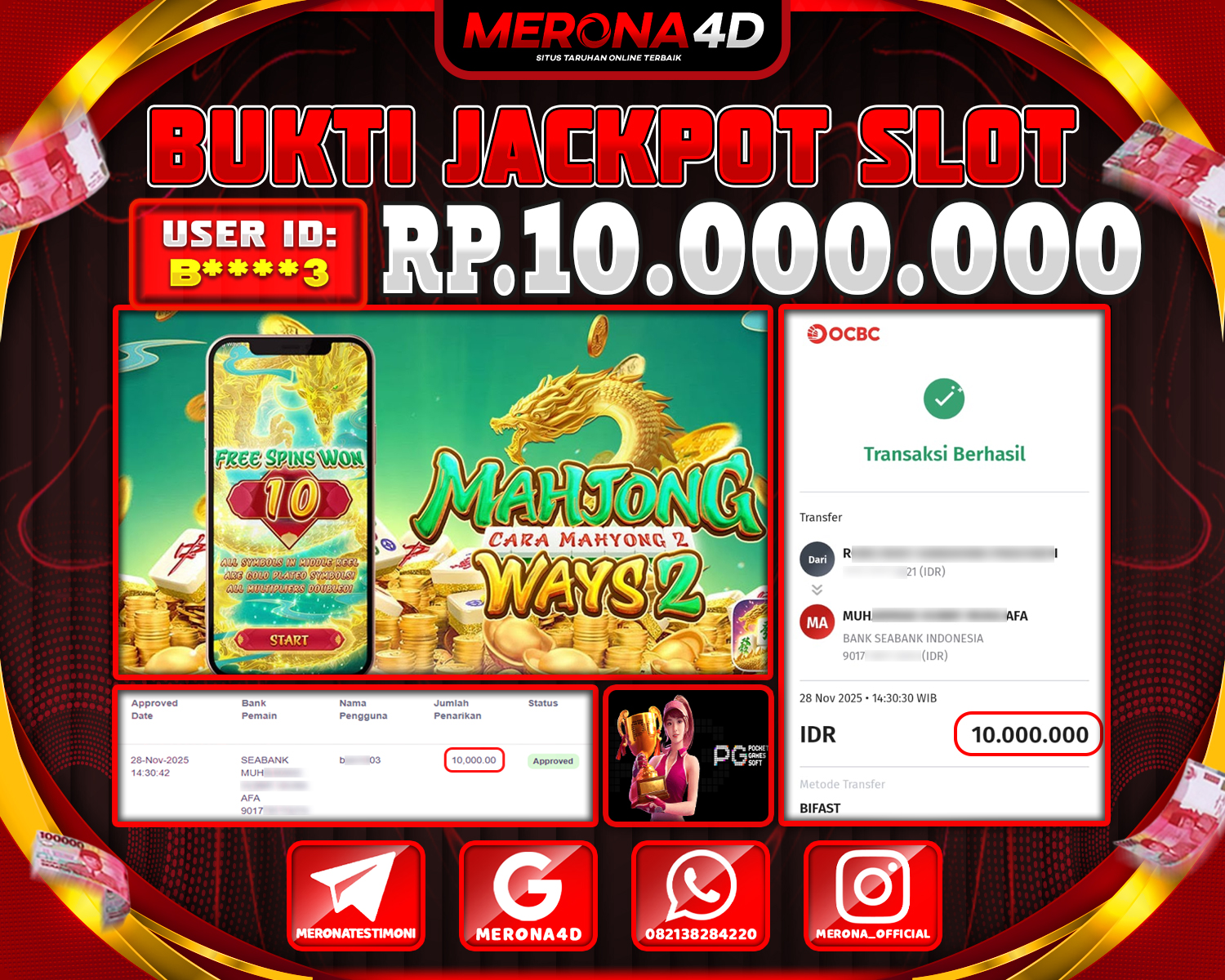 Selamat Kepada Member MERONA4D B****3 Telah Jackpot Di MAHJONG WAYS 2