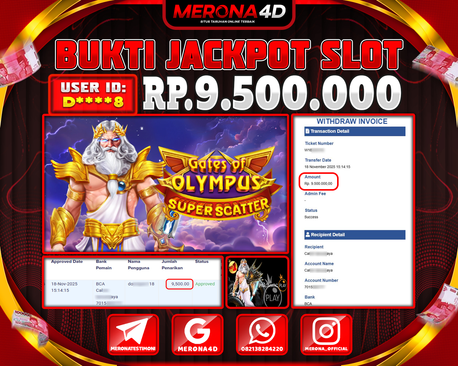 Selamat Kepada Member MERONA4D D*****8 Telah Jackpot Di GATES OF OLYMPUS SUPER SCATTER