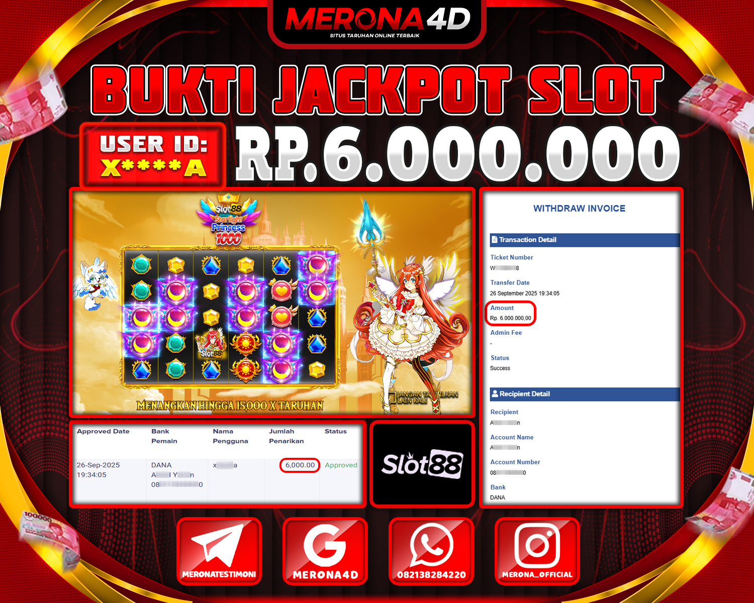 Selamat Kepada Member MERONA4D X****A Telah Jackpot Di SLOT88 STARLIGHT PRINCESS 1000