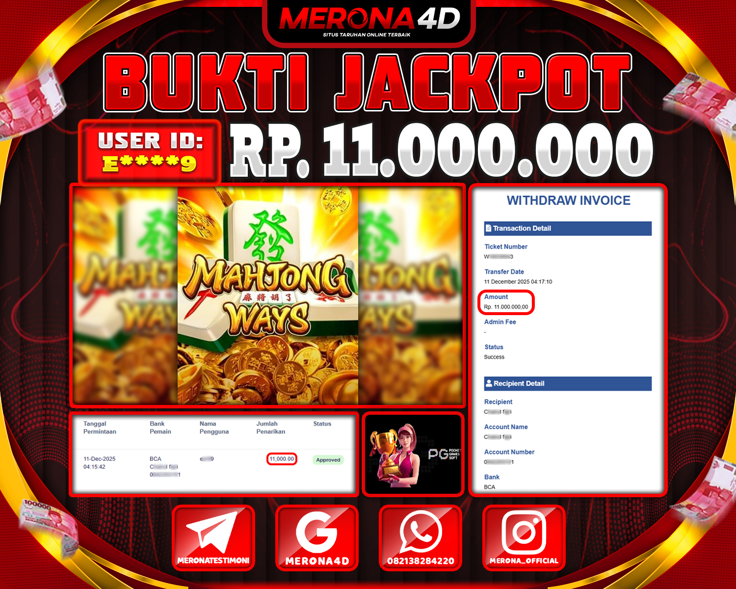Selamat Kepada Member MERONA4D E****9 Telah Jackpot Di MAHJONG WAYS 1