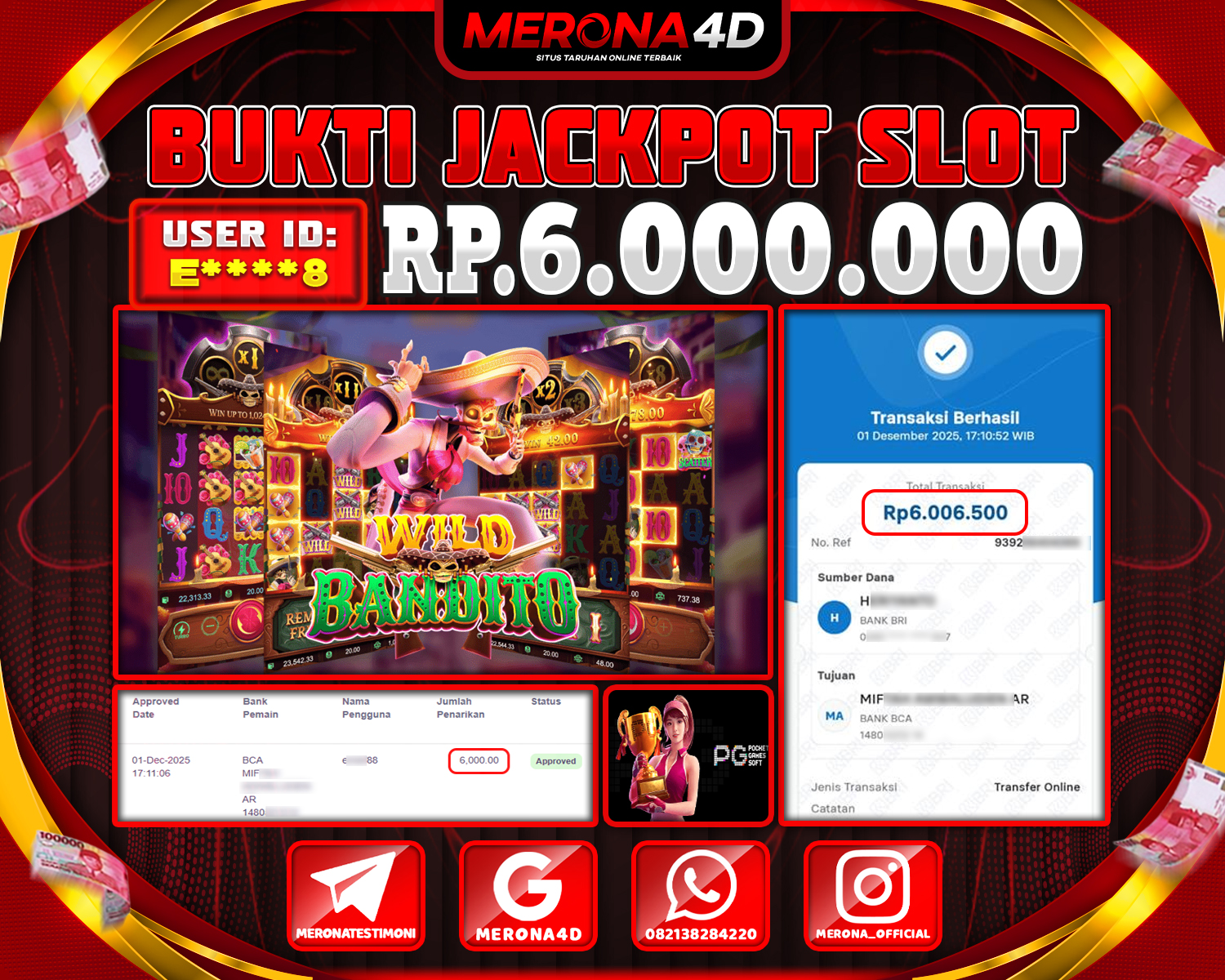 Selamat Kepada Member MERONA4D E****8 Telah Jackpot Di WILD BANDITO