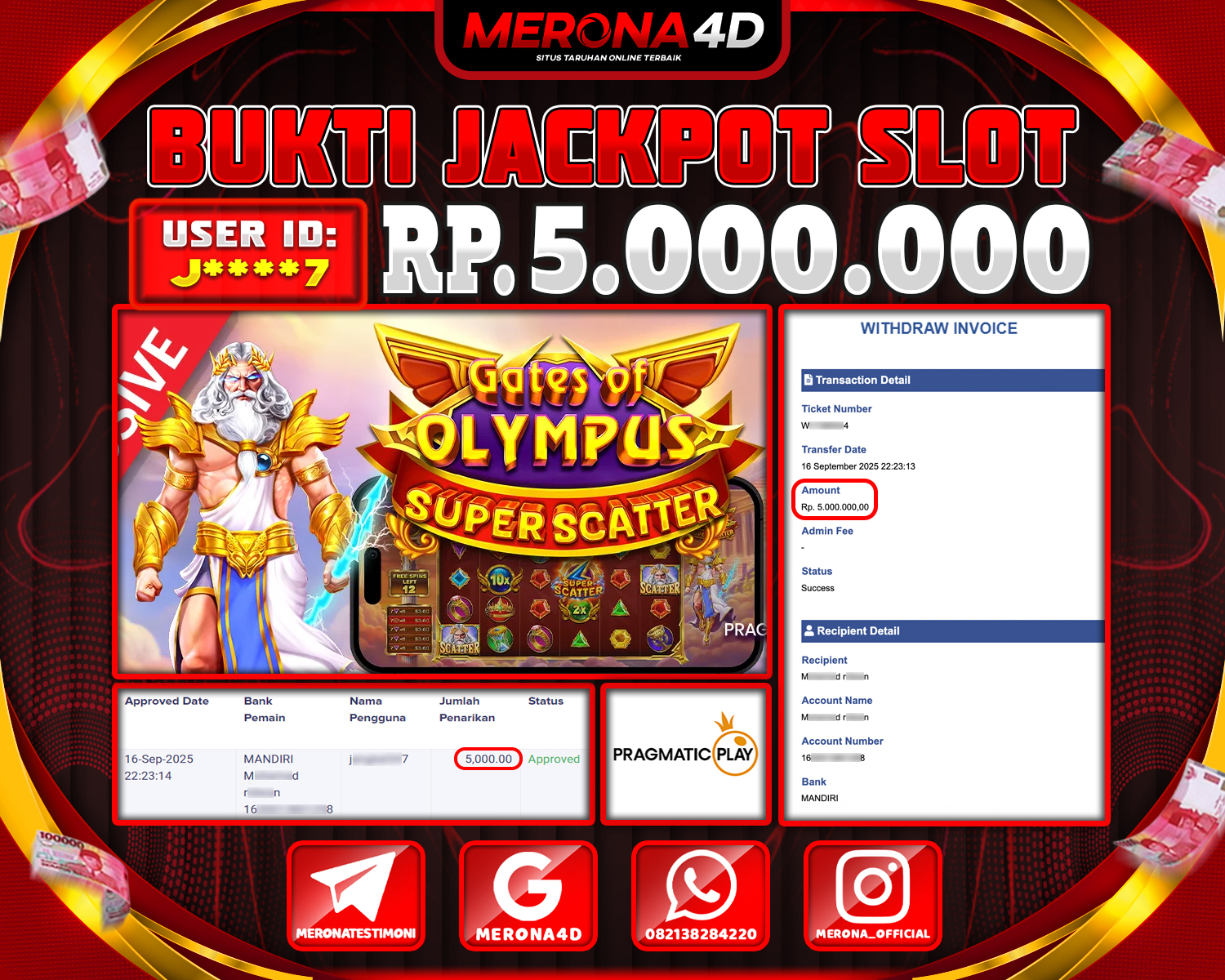 Selamat Kepada Member MERONA4D J****7 Telah Jackpot Di GATES OF OLYMPUS SUPER SCATTER