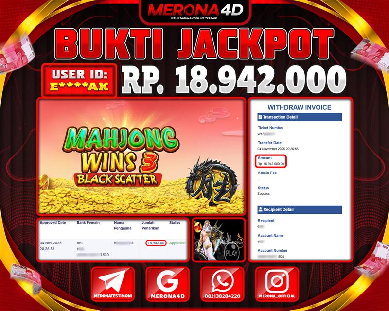 Selamat Kepada Member MERONA4D E*****K Telah Jackpot Di MAHJONG WINS 3 BLACK SCATTER