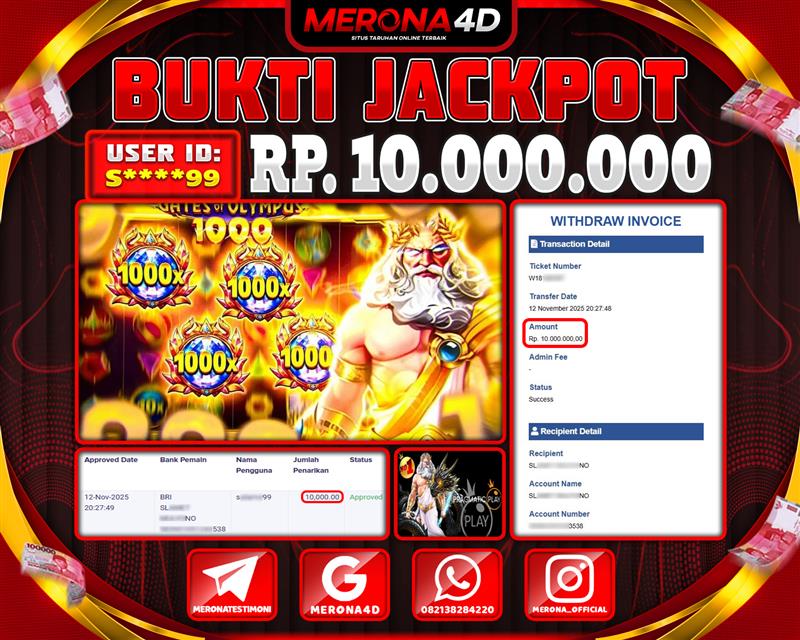 Selamat Kepada Member MERONA4D S*****99 Telah Jackpot Di GATES OF OLYMPUS 1000
