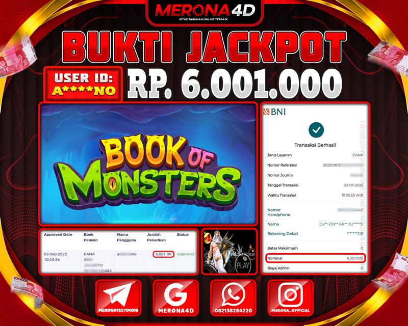 Selamat Kepada Member MERONA4D A*****NO Telah Jackpot Di BOOK OF MONSTERS