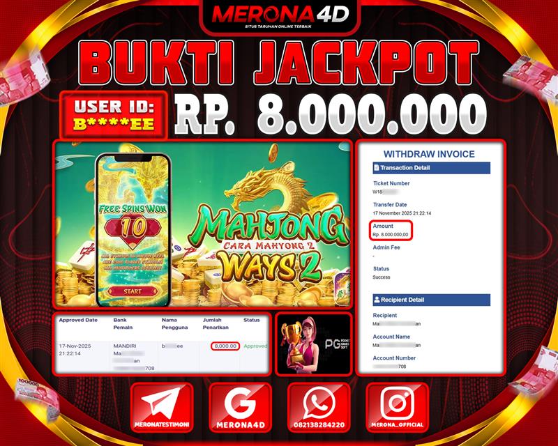 Selamat Kepada Member MERONA4D B****7 Telah Jackpot Di MAHJONG WAYS 2
