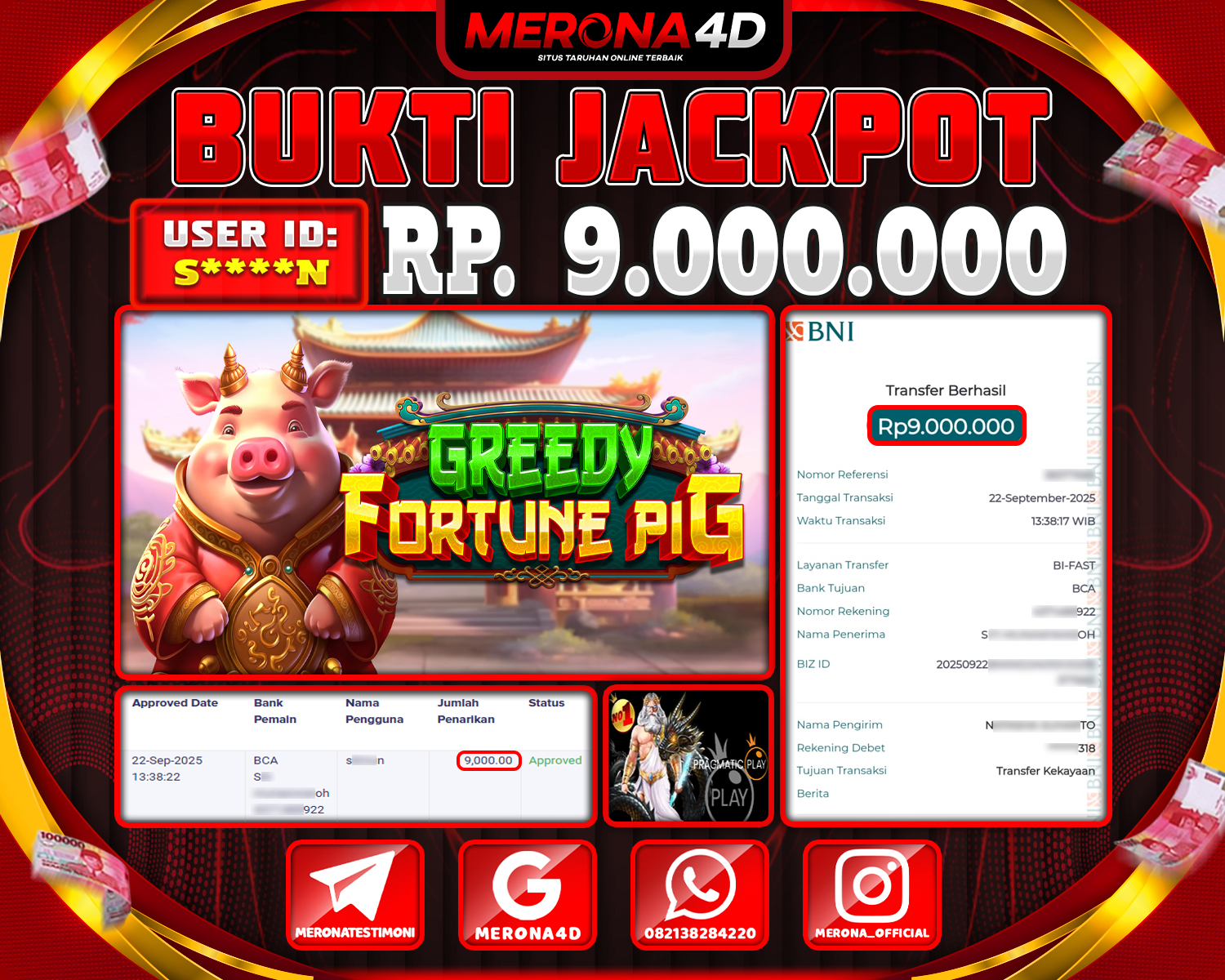 Selamat Kepada Member MERONA4D S*****N Telah Jackpot Di GREEDY FORTUNE PIG