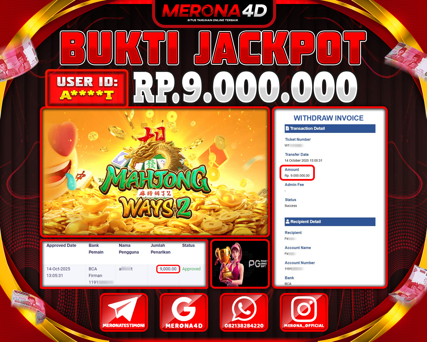 Selamat Kepada Member MERONA4D Aβ­‘οΏ½***οΏ½β­‘T Telah Jackpot Di MAHJONG WAYS 2