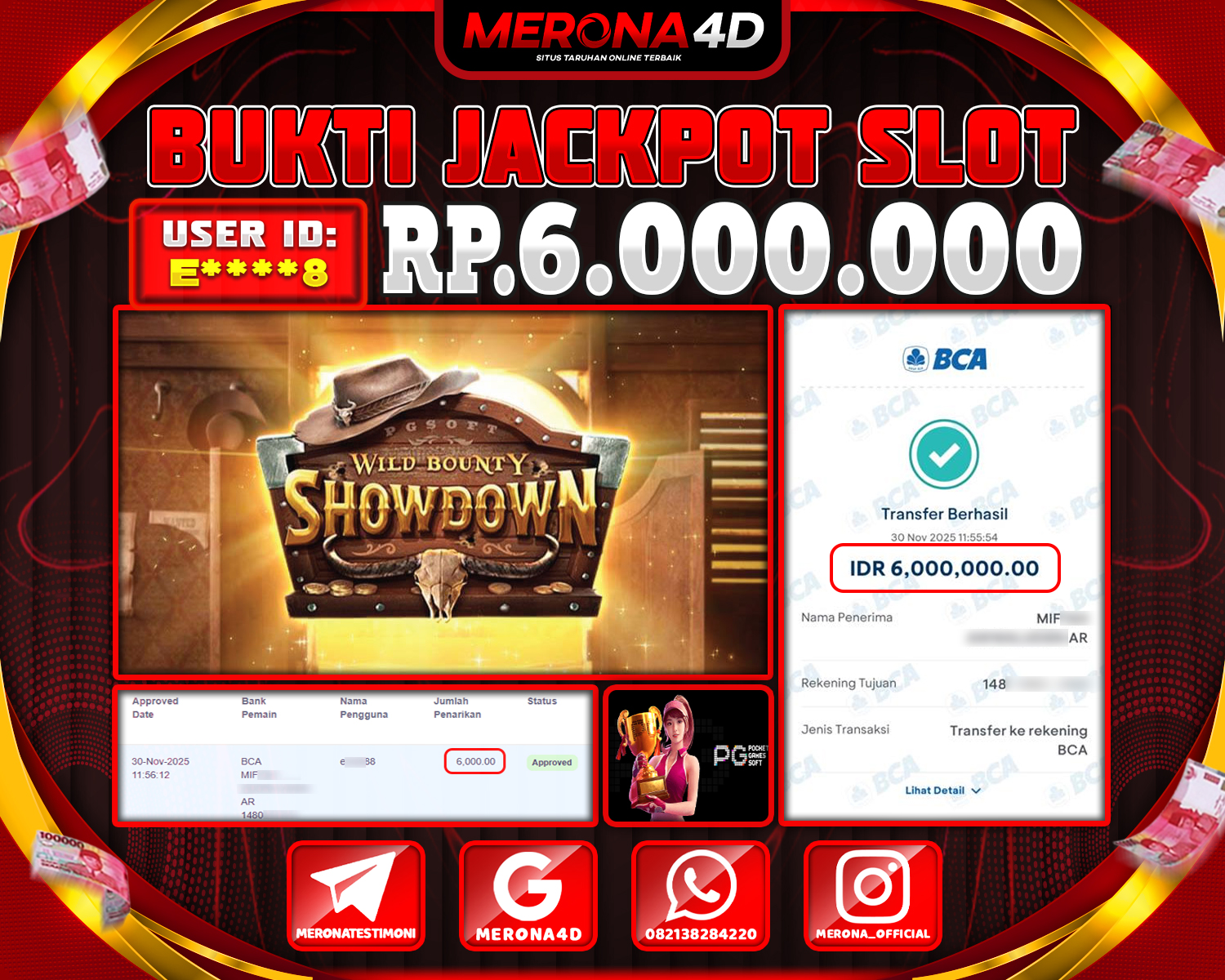 Selamat Kepada Member MERONA4D E****8 Telah Jackpot Di WILD BOUNTY SHOWDOWN