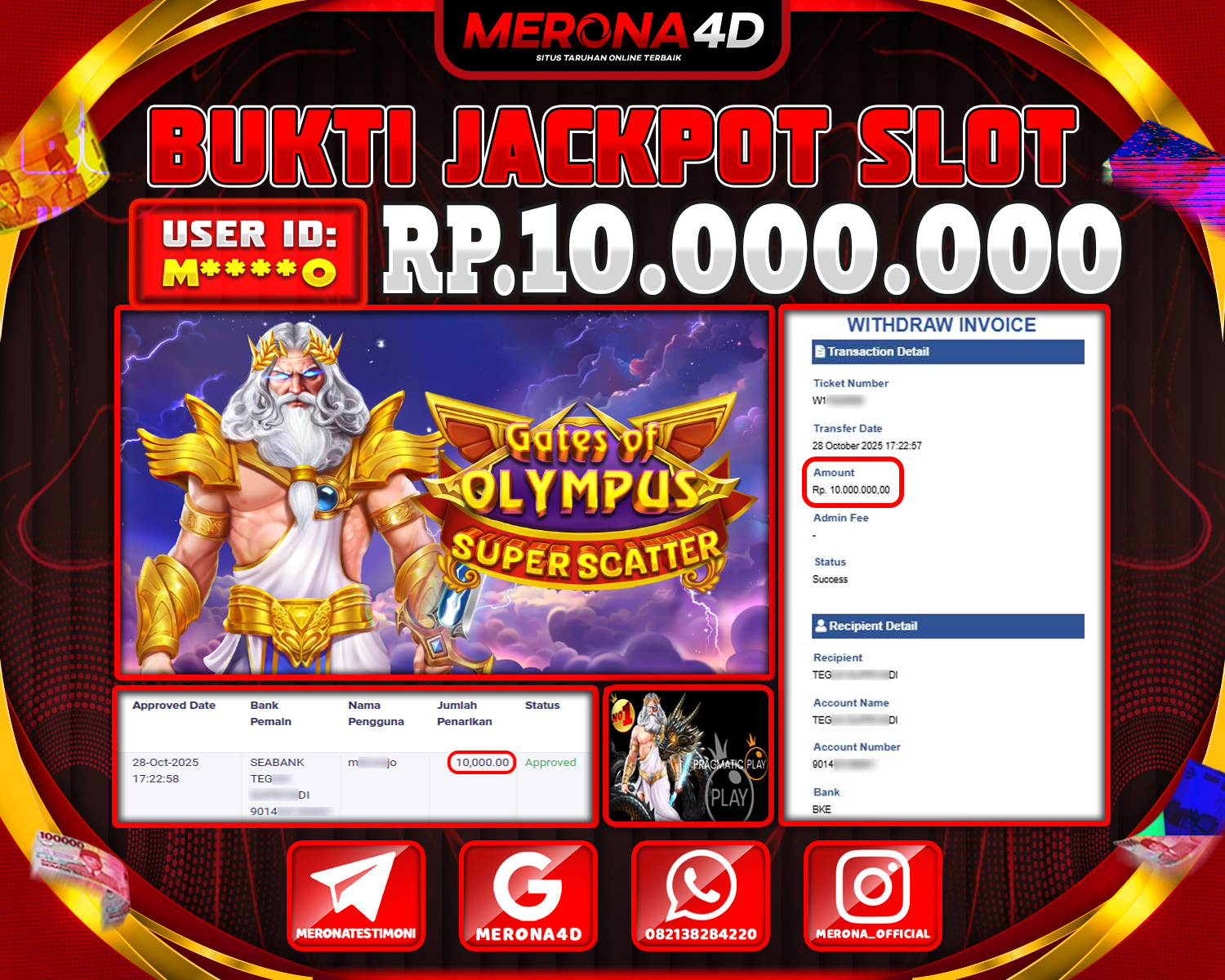 Selamat Kepada Member MERONA4D G*****5 Telah Jackpot Di GATES OF OLYMPUS 1000