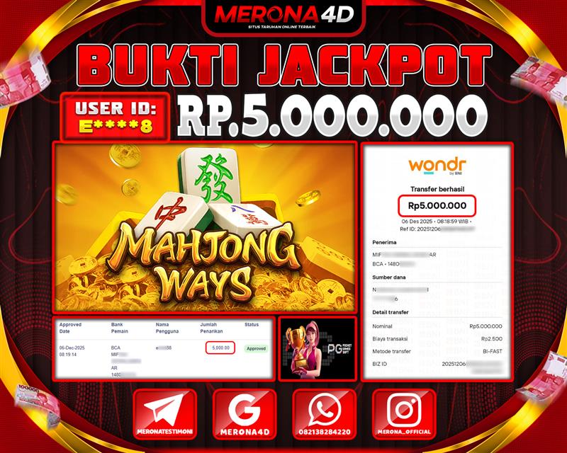 Selamat Kepada Member MERONA4D E*****8 Telah Jackpot Di MAHJONG WAYS 2