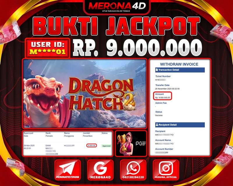 Selamat Kepada Member MERONA4D M*****01 Telah Jackpot Di DRAGON HATCH 2