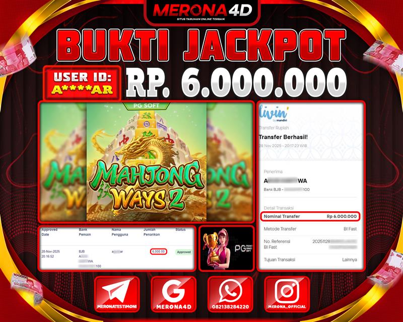 Selamat Kepada Member MERONA4D A*****AR Telah Jackpot Di MAHJONG WAYS 2