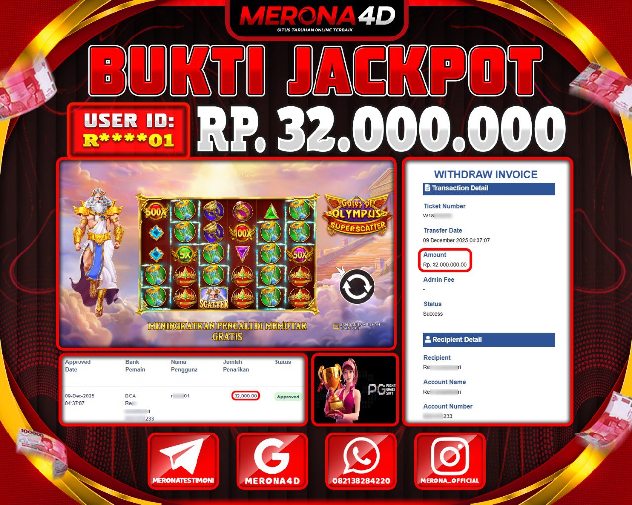 Selamat Kepada Member MERONA4D R*****01 Telah Jackpot Di GATES OF OLYMPUS SUPER SCATTER