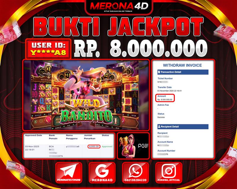 Selamat Kepada Member MERONA4D Y*****A8 Telah Jackpot Di WILD BANDITO