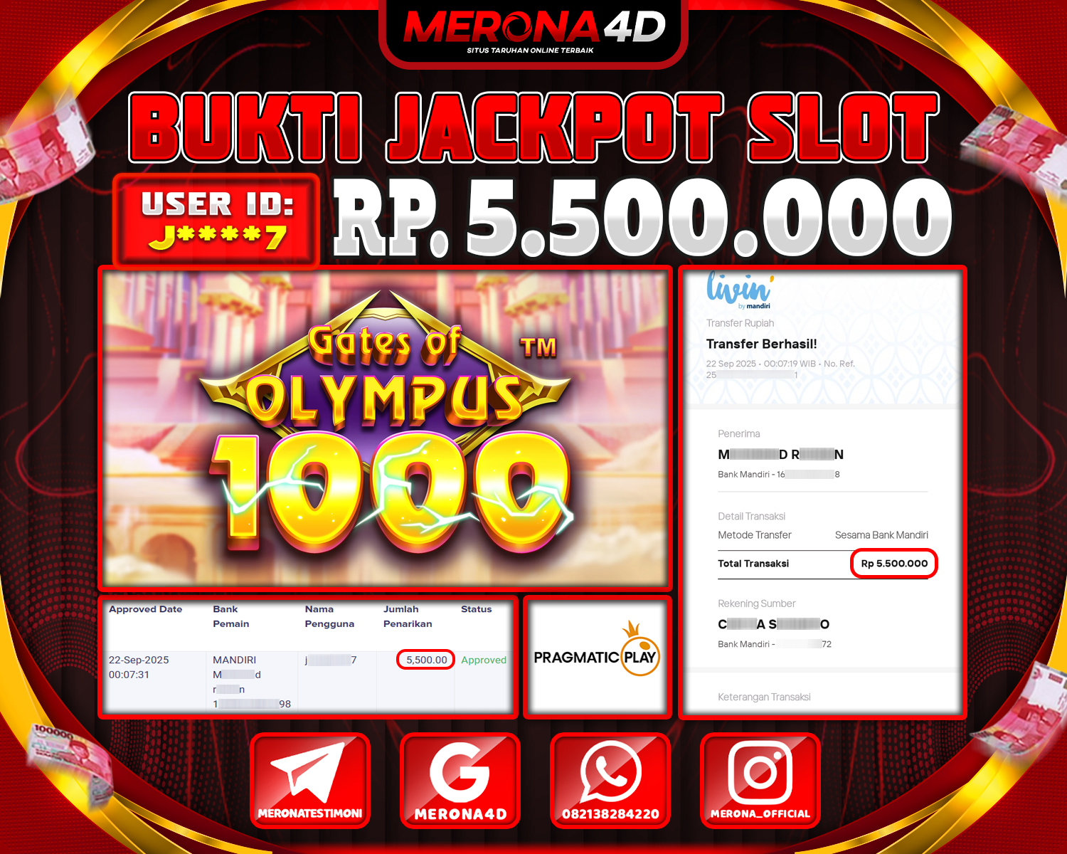 Selamat Kepada Member MERONA4D J****7 Telah Jackpot Di GATES OF OLYMPUS 1000