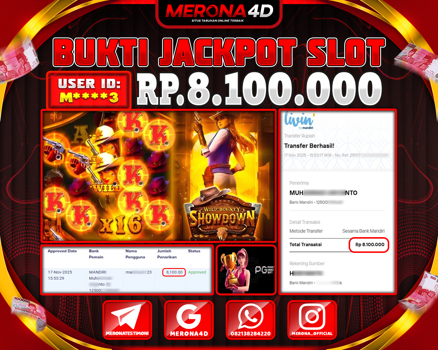 Selamat Kepada Member MERONA4D P*****87 Telah Jackpot Di WILD BANDITO