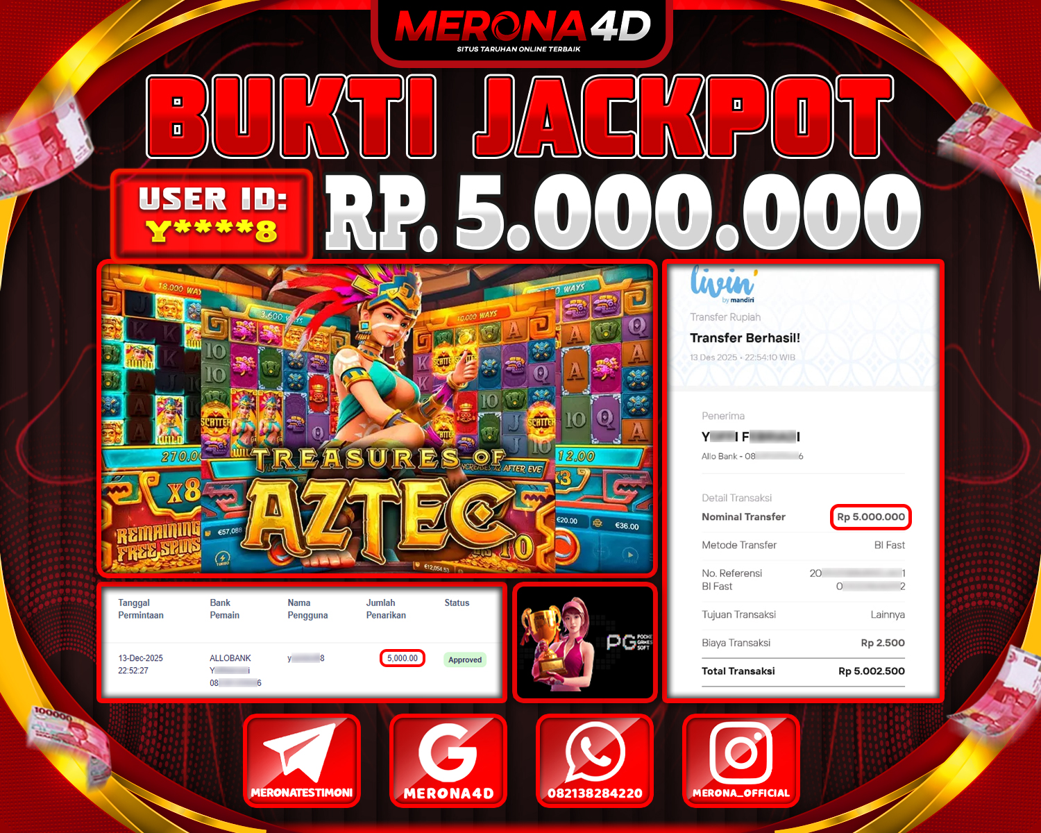 Selamat Kepada Member MERONA4D Y****8 Telah Jackpot Di TREASURES OF AZTEC