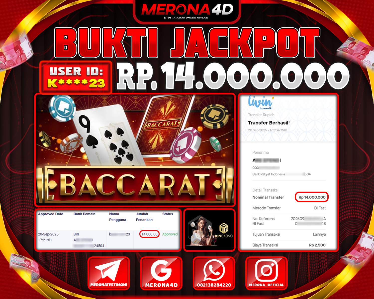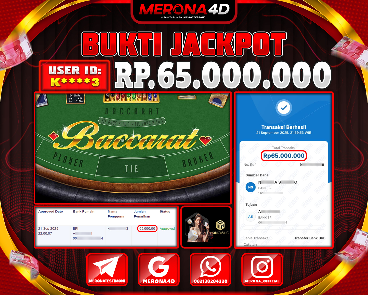 Selamat Kepada Member MERONA4D K****3 Telah Jackpot Di BACCARAT